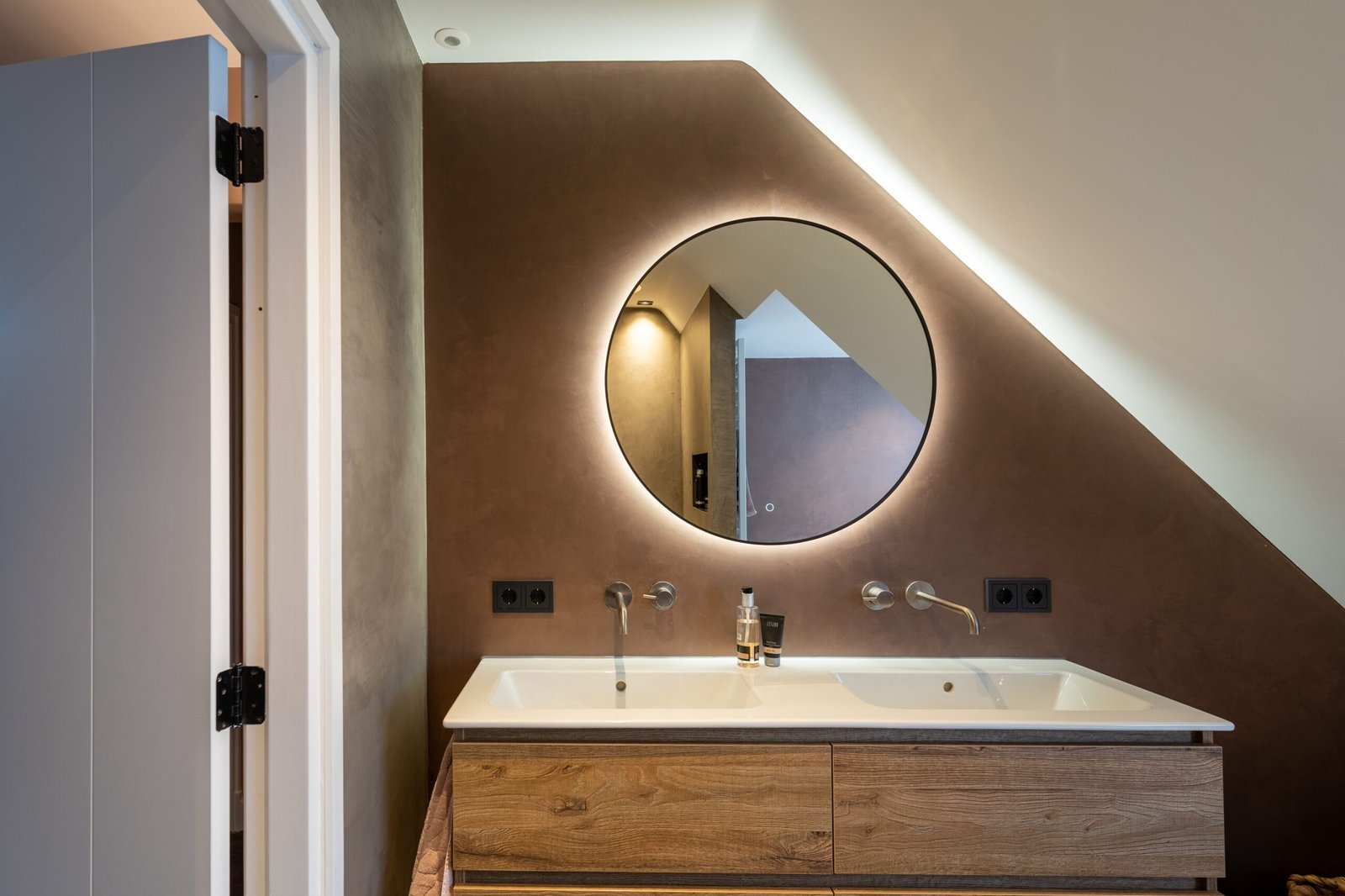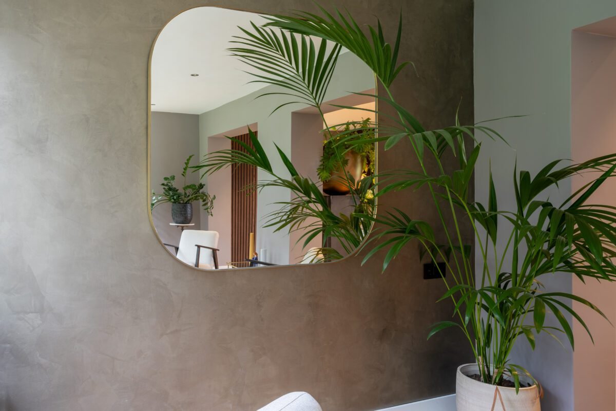 Voor deze stijlvolle villa hebben we gewerkt met een warme kalkverf in combinatie met een subtiele veegtechniek voor een zachte, natuurlijke uitstraling. In de hal is gekozen voor een decoratieve stucafwerking met lichte glans, wat direct bij binnenkomst een gevoel van luxe en rust geeft.